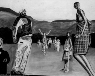 Flash forward 200, I was learning about the Masai Warriors in Africa. A ritual about becoming a man. A young boy goes into the wild, captures a lion, and comes home with it, to show his machismo. The men join in a circle, jumping up and down. I was quickly reminded of the hora, a Jewish dance, played out in a circle. While reflecting on this ritual my mind created a painterly scene, as pictured above. Massai men and study abroad friends surround me celebrating another coming of age ritual now 21. The fun ritual of being lifted up in a chair during the hora celebrates the excitement of this mitzvah. The Massai women do not do the lion ritual, they have others. So I was thinking about the roles of men and women and how they are similarly different.